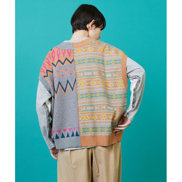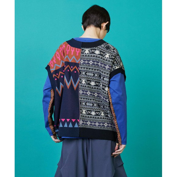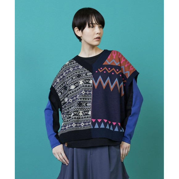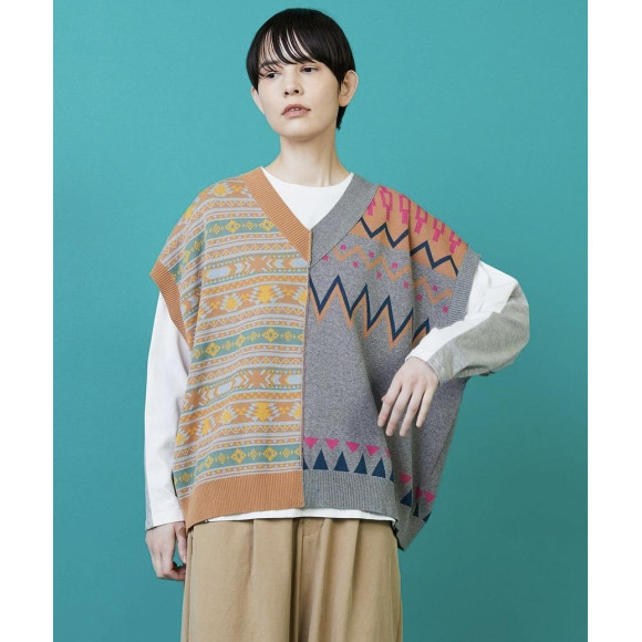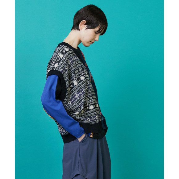 【디자인】느긋한 와이드 실루엣이면서, 짧은 착장하고 무겁지 않은 가벼운 실루엣으로 완성하고 있습니다.좌우로 대담하게 전환한 무늬는 왼쪽은 북유럽의 전통적인 무늬를 어레인지하고, 오른쪽은 미국의 전통적인 무늬를 어레인지한 다른 요소의 조합을 하고 있습니다.배색이나 무늬의 크기에도 구애되어 베이직한 아이템에 그 밖에 없는 임팩트를 만들고 있습니다.