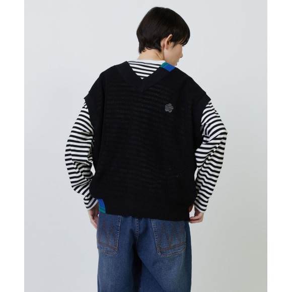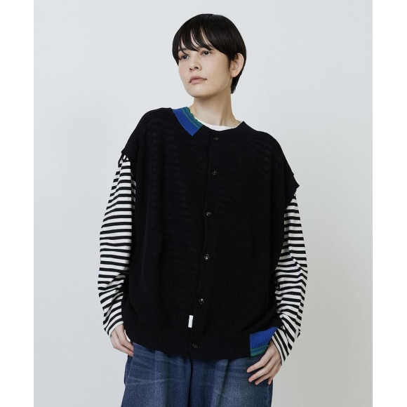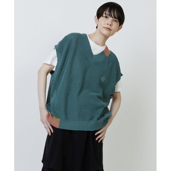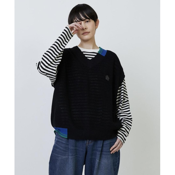 【디자인】느긋한 와이드 실루엣의 V넥 베스트는 적당한 여유와 너무 길지 않은 착장으로 편안한 실루엣으로 완성하고 있습니다.세로 라인이 특징적인 편 축편을 베이스로 옆에 들어간 별편의 라인이나 깃이나 옷자락의 아신메트리인 배색이 심플한 가운데에도 악센트를 만들고 있습니다.가슴의 「퍼키」의 자수도 신원단에 동색형으로 자연스럽게 액센트가 되고 있습니다.